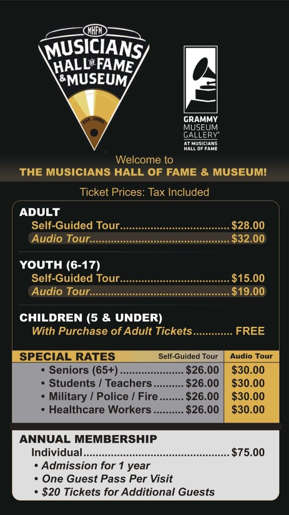 The Musicians Hall of Fame & Museum honors all musicians regardless of genre or instrument. The MHOF timeline starts with the beginning of recorded music and inductees are nominated by current members of the American Federation of Musicians and by other music industry professionals.